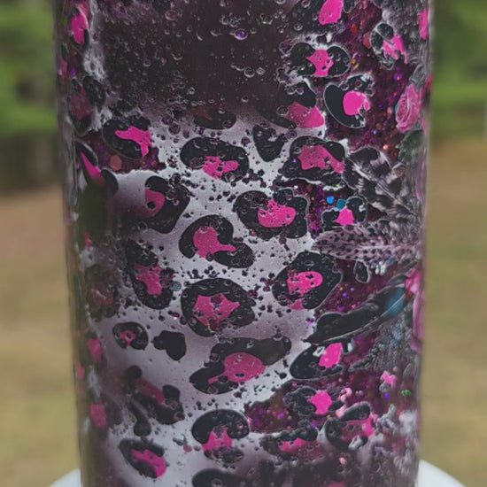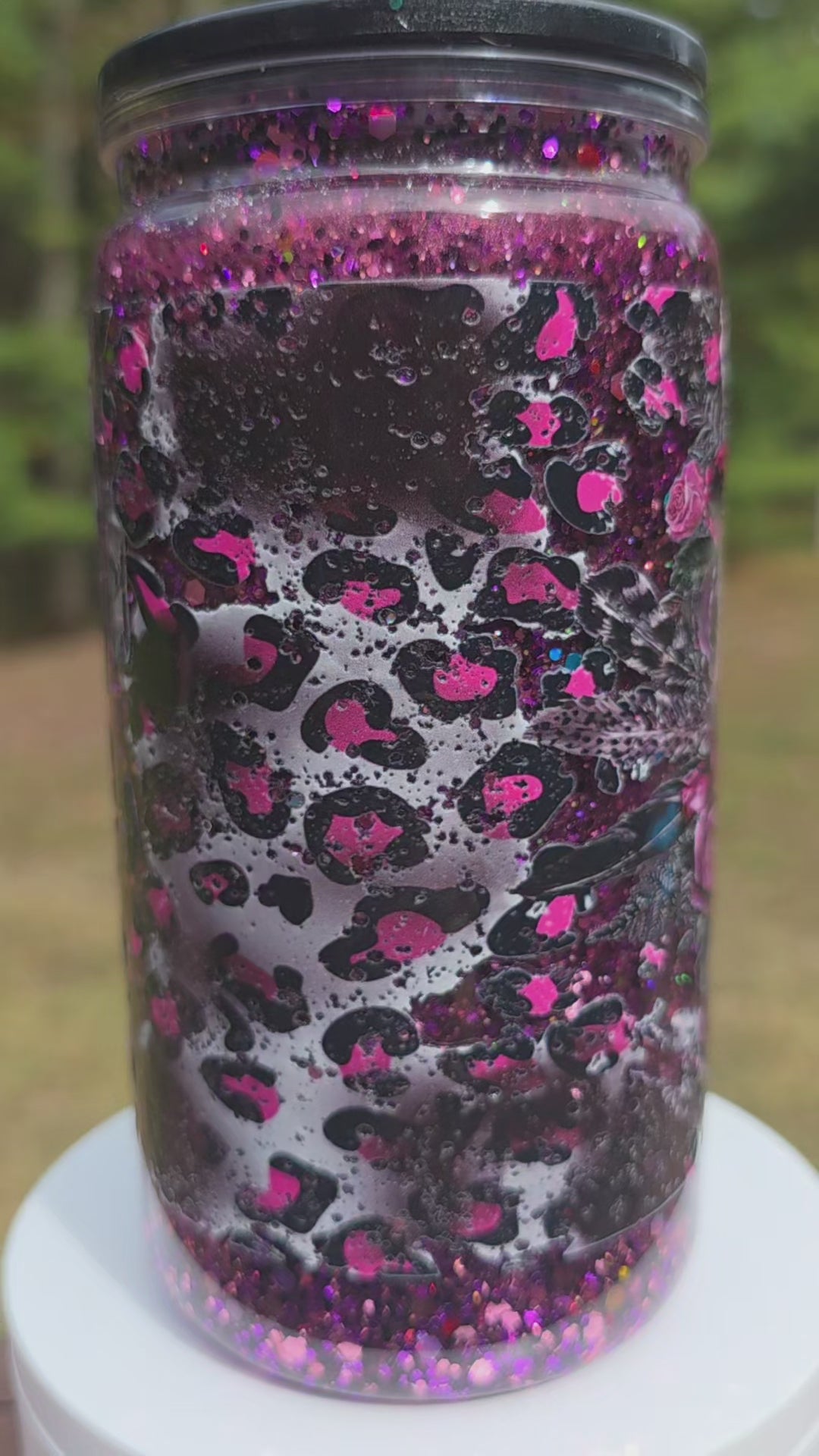 This 16 oz snow globe tumbler features a captivating blend of purple and black glitter, creating a striking visual effect. It comes with a matching skull wrap, adding a bold, edgy touch to its design. Perfect for keeping your drinks stylishly contained while showcasing unique artistry, this tumbler combines functionality with standout aesthetics.